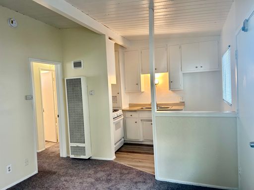 The unit features a functional layout with a combination of flooring types and practical kitchen storage.