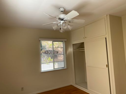 The bedroom includes a ceiling fan, closet space, and two windows for natural light and ventilation. A wall sleeve air conditioner is located in the living room area. Water and trash utilities are included in the rent.