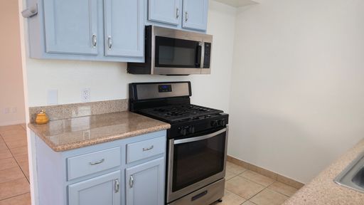 Stylish kitchen featuring: Blue cabinets, Modern stainless-steel dishwasher, stove, and over-range microwave