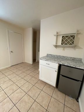 This apartment is a studio with a bathroom. It is equipped with a dorm fridge and a microwave.